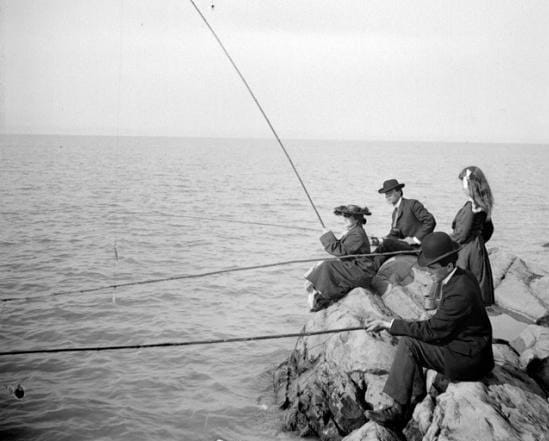 This photo from around 1900 shows a group of anglers casting their lines into the mighty river, dressed in what was apparently the fishing attire of the day: suits, hats, and long dresses. No Gore-Tex or fishing vests in sight - just determination and maybe a bit of luck.